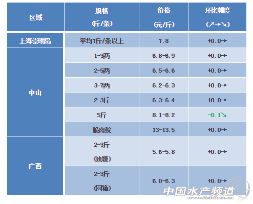 中國水產(chǎn)頻道獨家報道, 文/ 粵海飼料集團(tuán)、水產(chǎn)前沿 彭曉君 草魚 中山區(qū)域:本周價格與上周持平,整體價格處于回落階段。小規(guī)格魚種價格高位回落;超市草魚近期市場銷量增加,價格回落;5斤以上存塘量少價格堅挺;氣溫回升,脆肉價格高位回落。 上海區(qū)域:草魚相比年后小幅下跌,目前處于穩(wěn)定,由于清明前后需求量會有所增加,價格預(yù)計會小幅上漲。 廣西區(qū)域:目前氣溫回暖,草魚供需穩(wěn)定,價格經(jīng)過近幾周的上升后逐漸企穩(wěn)。預(yù)計臨近清明會有一定的上漲空間。 ※上述報價可能會因區(qū)域、規(guī)格、品質(zhì)和時間等因素的不同而會產(chǎn)生差異,在此僅供參考。環(huán)比幅度以上周價格與本周價格數(shù)據(jù)做對比。 【關(guān)鍵字】:草魚 塘頭價 水產(chǎn)養(yǎng)殖 |