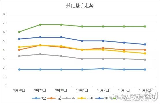 本周興化母蟹各規格28日暴跌7-10元/斤,29日略微回升,后又進入跌勢。如2兩母蟹,由27日的40元/斤跌至28日的33元/斤,29日上漲2元/斤,后又一路跌至29元/斤。公蟹28日微跌,隨后保持平穩。