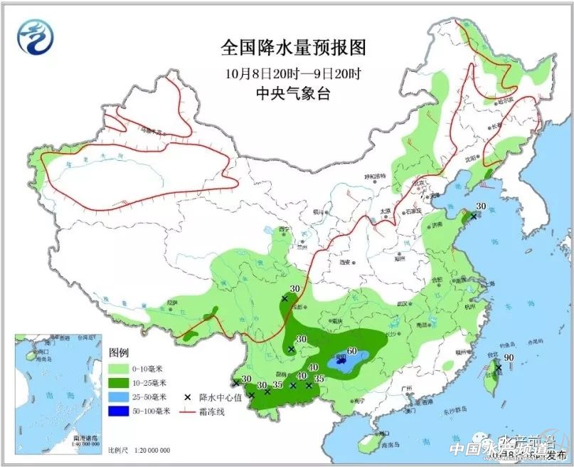 10月8日20時至9日20時,內(nèi)蒙古東北部、青海南部、川西高原北部、西藏北部等地的部分地區(qū)有小到中雪或雨夾雪,東北地區(qū)北部和東南部、黃淮東部、江淮、江南大部、西南地區(qū)大部、華南西部、西藏中東部和臺灣島等地部分地區(qū)有小到中雨,其中,川西高原北部、四川南部、貴州中南部、云南南部、廣西北部、山東東部、臺灣東北部等地部分地區(qū)有大雨,貴州中部、臺灣島東北部等地局地暴雨(50——90毫米)。內(nèi)蒙古中東部、華北、黃淮、江淮東部、遼寧南部等地的部分地區(qū)有4——6級風(fēng)(見圖1)。渤海將有6——7級、陣風(fēng)8級的東北風(fēng)轉(zhuǎn)西北風(fēng)。