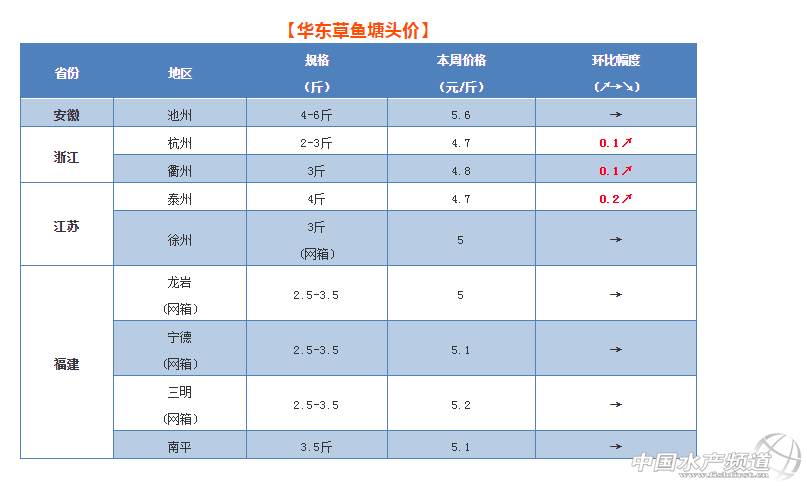 本周華東地區草魚行情也不斷聽到利好消息。其中,江蘇高郵、淮安、無錫等地均出現回暖;浙江地區有小幅上漲;福建地區目前整體價格仍然保持穩定,部分地區草魚開始好賣了一些。