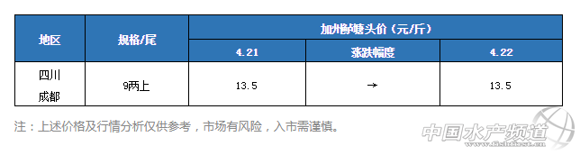 四川成都:今天成都9兩上報價13.5元/斤,魚價企穩。據當地流通商介紹,目前成都當地鱸魚產卵后減重明顯,養戶出魚意愿不高,預計受廣東魚價上漲影響,短期內魚價或將上漲。