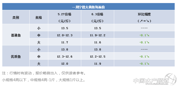 本周寧德地區大黃魚全部規格價格都小幅下跌,其中大規格魚價格相比一月前更是一蹶不振。據了解,目前網箱存魚量仍然較多,遠超市場消費容量,是制約價格上漲的主要原因。