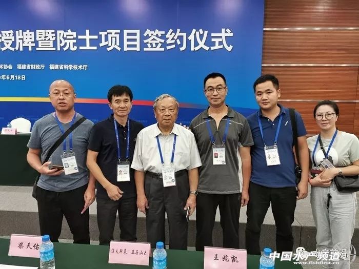 福建省院士專家工作站授牌儀式合影(左:鑫洋賓公司董事長 楊國賓 中:中山大學林浩然院士 右:黃海水產研究所 梁友)