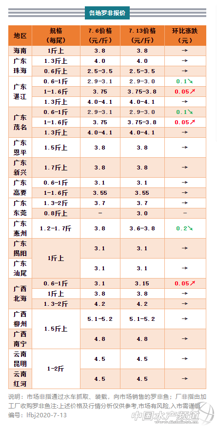 粵東地區:惠州1.2-2斤規格走本地市場羅非早上車3.6元/斤,環比上周下調0.2元/斤,一次5千斤左右,而下午車3.8元/斤,同上周價格;外省水車抓1斤上規格羅非3.4-3.5元/斤,同上周,出價依然偏低,出魚量和頻率皆不及本地市場車;揭陽和汕尾1斤以上規格廠非(走汕尾本地凍廠)塘頭價3.1元/斤,1-1.2斤上規格市場非3.6-3.7元/斤,皆保持上周行情。