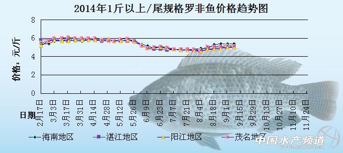 中國水產頻道原創報道,以下是海南地區、湛江地區、陽江地區、茂名地區2014年1斤以上/尾規格羅非魚的價格趨勢圖。圖中可以很明顯的看出,2月中旬直到5月底,羅非魚的整體價格都是處于比較高企的狀態,但是6月份到7月份,羅非魚的整體價格就處于一個相對低迷的狀態,整體價格下滑的比較厲害。到了8月初,各地的羅非魚價格開始慢慢上漲。具體價格趨勢如下: