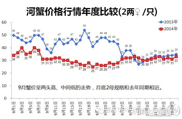 根據(jù)經(jīng)驗,2母3公的價格是最具代表性的河蟹價格,而3母4公則是大規(guī)格蟹價的代表。現(xiàn)以2兩母蟹、3兩母蟹做同期對比分析: