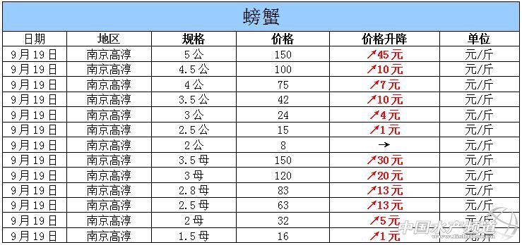 中國水產頻道獨家報道,據網友提供消息,2015年9月19日江蘇高淳河蟹價格行情如下:
