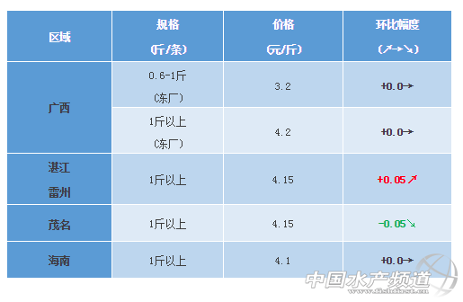 廣西區域:隨著晝夜溫差拉大,天氣漸冷,存塘規格羅非基本上已經出完,價格持續低迷難以有起色。走市場鮮活大規格羅非價格也不理想,1.3斤起4.3元/斤。
