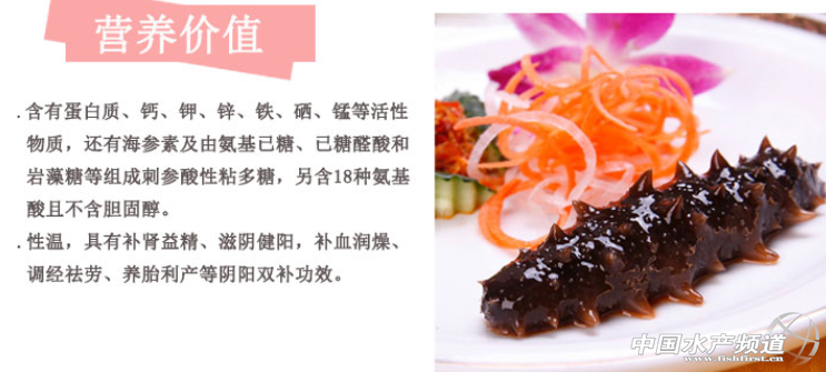 海參的營養(yǎng)價值之分豐富,藥理活性十分廣泛,幾乎涵蓋了當(dāng)前對人類健康構(gòu)成威脅的主要病癥,被稱為“百病之克星”。海參資訊網(wǎng)中有關(guān)海參的很多介紹:海參的組成部分也有很多,被稱為“八珍之首”。海參除了含有豐富的蛋白質(zhì)以外、還有大量的微量元素。鈣、鐵、鋅、硒、鉀、錳外,還含有其他補(bǔ)品所沒有的活性成分如海參素、酸性粘多糖和海參皂甙,另含18種氨基酸且不含膽固醇。
