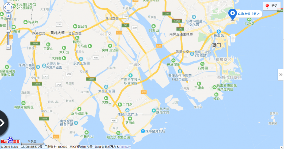 | 占地23萬平米,是集會議、度假、商務、旅游為一體的“中國首家休閑度假型五星級酒店”,曾獲“中國十佳會議會展酒店”、中國首屆“飯店金星獎”酒店、“廣東省著名商標”,享有“花園城市中的花園”的美譽。 | | 距九洲港碼頭0.5公里; 距拱北口岸5公里; 距珠海機場43公里; 距珠海免稅商場1.52公里。 |