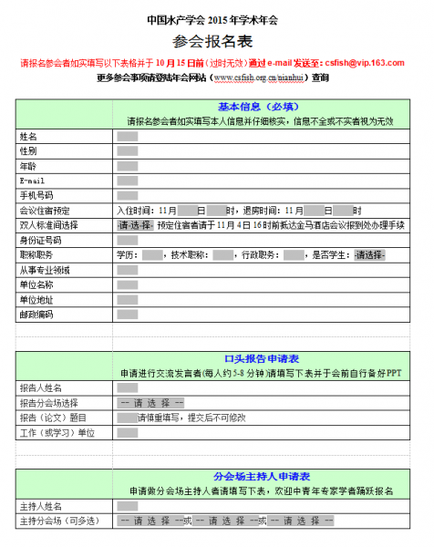請登陸年會網站下載《參會報名表》并于2015年10月15日前填好后發送至E-mail:csfish@vip.163.com。