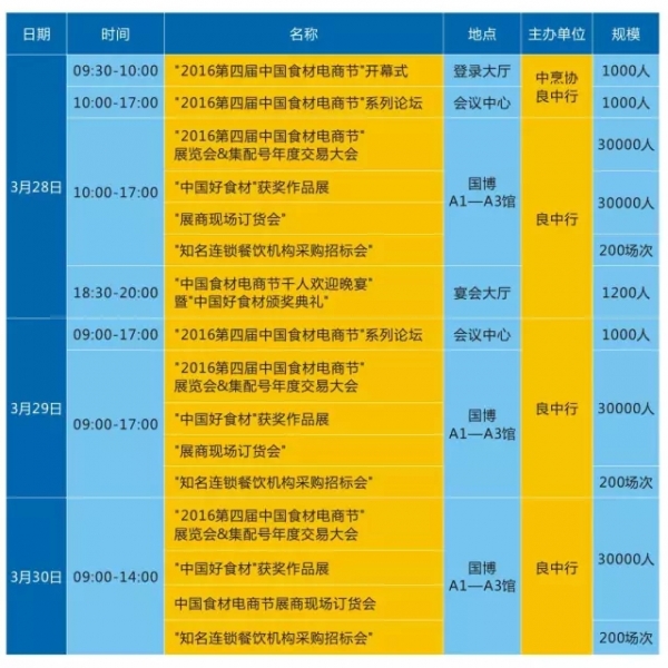 2016第四屆“中國(guó)食材電商節(jié)”預(yù)計(jì)展覽展示面積30000平米,參展企業(yè)800余家,展位數(shù)達(dá)1200個(gè),專業(yè)采購(gòu)商及觀眾突破50000人次,同期活動(dòng)以新菜評(píng)選、食材招標(biāo)、食材訂貨、論壇研討等形式共計(jì)舉辦30余場(chǎng),預(yù)計(jì)成交額超過(guò)30億元。