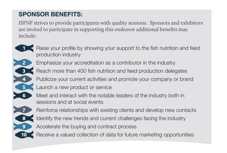 The International Symposium on Fish Nutrition and Feeding provides opportunities for a range of sponsor and exhibitor objectives, enabling interac-tion with key players in the field while marketing products or services.