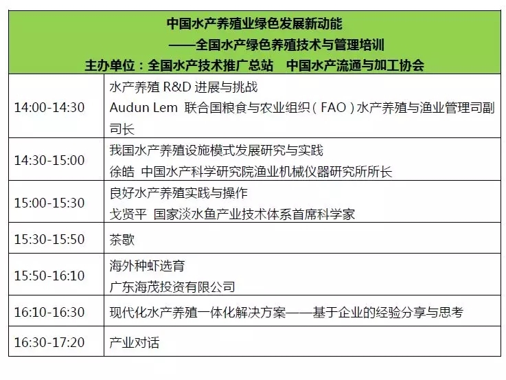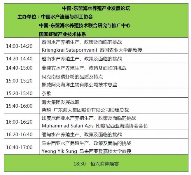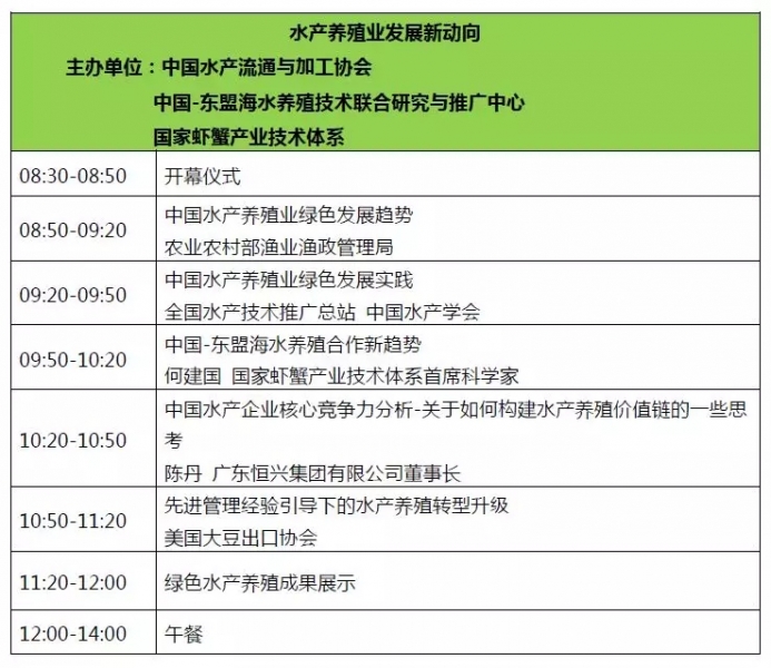 2019年5月17 -18日農業(yè)農村部水產養(yǎng)殖綠色發(fā)展系列活動之“2019全球水產養(yǎng)殖大會”和“第十一屆中國蝦產業(yè)發(fā)展研討會”將在珠海國際展覽中心盛大召開。 指導單位 農業(yè)農村部漁業(yè)漁政管理局 全國水產技術推廣總站 中國水產學會 主辦單位 中國水產流通與加工協(xié)會 中國-東盟海水養(yǎng)殖技術聯(lián)合研究與推廣中心 國家蝦蟹產業(yè)技術體系 戰(zhàn)略合作伙伴 廣東恒興集團有限公司 協(xié)辦單位 美國大豆出口協(xié)會 支持單位 廣東海茂投資有限公司 挪威阿克海洋生物有限公司 廣東海大集團股份有限公司 技術支持單位 國家大宗淡水魚產業(yè)技術體系 國家海水魚產業(yè)技術體系 國家貝類產業(yè)技術體系 國家藻類產業(yè)技術體系 國家特色淡水魚產業(yè)技術體系 2019全球水產養(yǎng)殖大會 時間:5月17日 地點:珠海國際會展中心,珠海廳1+2
