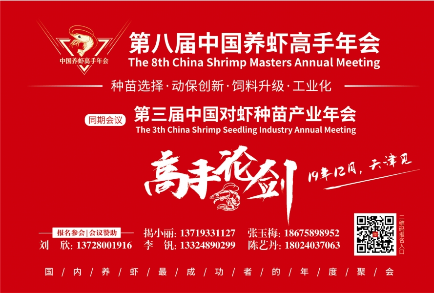 2019的1月4-5日在珠海舉辦的第七屆中國養蝦高手年會取得了巨大的成功,700多名參與者,50多家贊助商!今年,第八屆中國養蝦高手年會預計將吸引超過千名參與者和70多家贊助商前往天津,更多感興趣的企業和個人將參與其中。這是不容錯過的中國對蝦行業一年一度的頂級盛會!