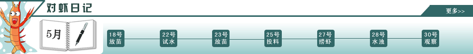 今天是放苗的第10天,蝦大概3公分左右了,改為三餐4斤一餐的開口料,準(zhǔn)備投喂O號料。塘水里繼續(xù)沒有看到水蛛等生物,喂料了透明度降低了,不過這是正常的【更多】 |
