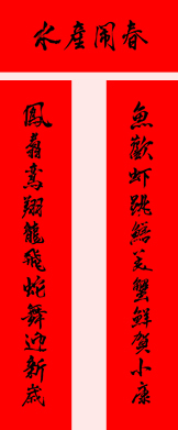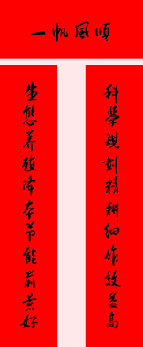 | 下聯:前沿傳喜訊,漁民奔富路,春夏秋冬大業興 |