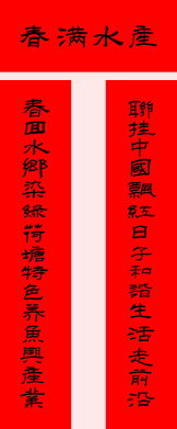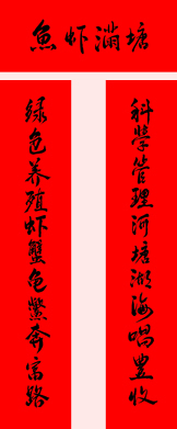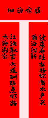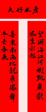 | 簡評:此聯在上下聯首嵌“水產前沿”。江河湖海對春夏秋冬,屬于工對。符合春聯的要求,有對行業的概括,也有對美好前景的展望,結句大氣。 |
