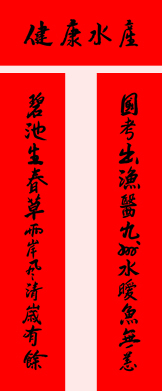 | 簡評:上聯國考出漁醫,意指全國執業漁醫考試,水產養殖順順利利不發病。下聯取材于南朝謝靈運所寫“池塘生春草”一詩,杜甫曾對該詩點評道:池塘春草謝家春,萬古千秋五字新。 |