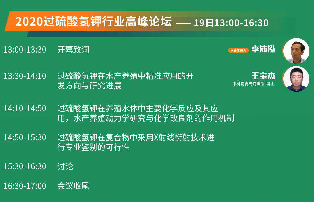 為引領過硫酸氫鉀產業規范升級,11月19日中國水產前沿展同期,由中國水產前沿展、上海翱圖實業有限公司主辦,翱圖(開封)環保科技有限公司承辦、中國漁業協會水產投入品分會、北京水世紀生物技術有限公司、山東嘉源環保科技有限公司、連云港永榮生物技術有限公司、北京漁經生物技術有限公司、上海鑫瑞博實業有限公司、天津創嘉生物技術有限公司協辦的“2020過硫酸氫鉀行業高峰論壇”盛大召開。數十個省份水產動保領域精英、企業代表、專家學者、養殖戶、經銷商等業內人士近200人出席論壇,共謀過硫酸氫鉀行業未來的發展。