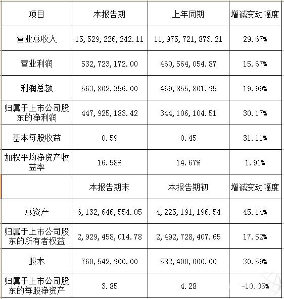 報告期內,公司經營狀況良好,業績得到持續增長。實現營業收入1,552,922.62 萬元,同比增長 29.67%。利潤總額以及歸屬于上市公司股東的凈利潤同比增長 19.99%以及 30.17%。