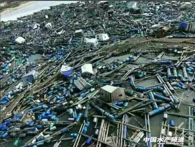 一個臺風(fēng)把養(yǎng)殖場全打沒了支離破碎的漁排、被風(fēng)浪打爛的鐵皮屋、恣意漂浮的藍色大桶……在坡頭南三大橋橋底,一個足球場大小的海面上,滿目瘡痍。