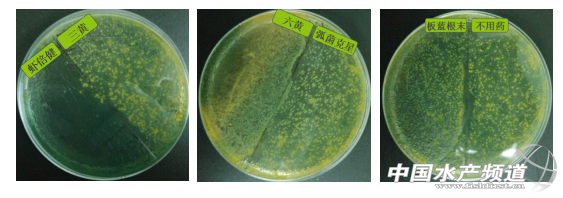 同樣的,利用上述方法,教你如何挑選有效的抗菌藥物:1、器具:根據待測藥物種類,準備礦泉水瓶數個、弧菌檢測板數個。 3、加藥: 蝦倍健瓶:加蝦倍健Ⅱ號浸膏2ml,搖勻,做好標記。 其他用藥瓶:加其他抗菌中藥2ml,搖勻,做好標記。 4、涂板:2分鐘后,各取0.1ml,分別均勻涂布于弧菌檢測板上,并做好標記; 5、效果觀察:室溫放置16-24小時后觀察比較弧菌數量。 以下為試驗對比的幾種藥物對黃弧菌的抗菌效果: