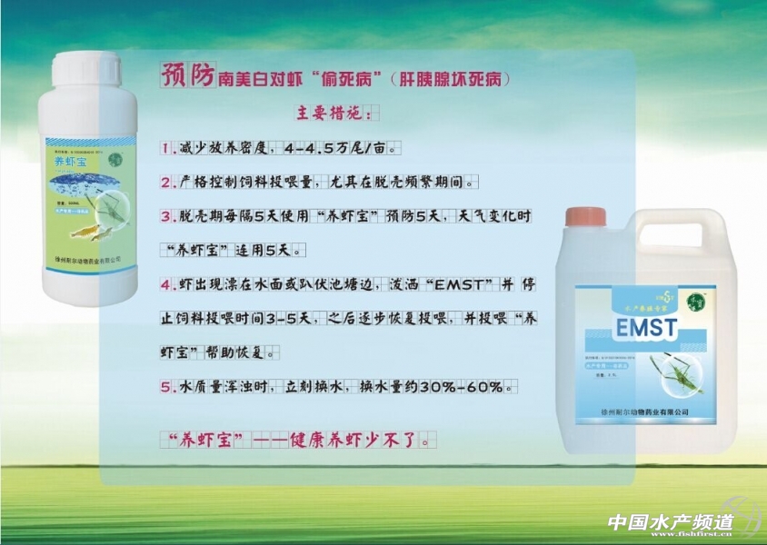 “白便”是蝦偷死病的前期,一旦發(fā)現(xiàn)“白便”,蝦開(kāi)始減食厭食,靠水塘岸邊,或浮游在水面上。肝胰腺萎縮,空腸胃,大量死亡。經(jīng)過(guò)2年多的探討、反復(fù)試驗(yàn),純中藥口服液制劑“養(yǎng)蝦寶”可起到較好的預(yù)防和早期“白便”治療效果,“養(yǎng)蝦寶”可在蝦10-60日齡易感期,經(jīng)常潑灑使用,或在見(jiàn)“白便”期間,大量連續(xù)使用,效果較好,是目前預(yù)防蝦偷死病和早期“白便”效果最好的藥物。一旦發(fā)現(xiàn)蝦浮游在水面或靠水塘岸邊,可迅速沿蝦浮游的水面或岸邊潑灑“EMST",并查看水質(zhì),發(fā)現(xiàn)水質(zhì)變壞,可換水40-60%,減少喂料,待蝦疾病恢復(fù)時(shí)增加喂料,并更換“養(yǎng)蝦寶”幫助體質(zhì)恢復(fù)。