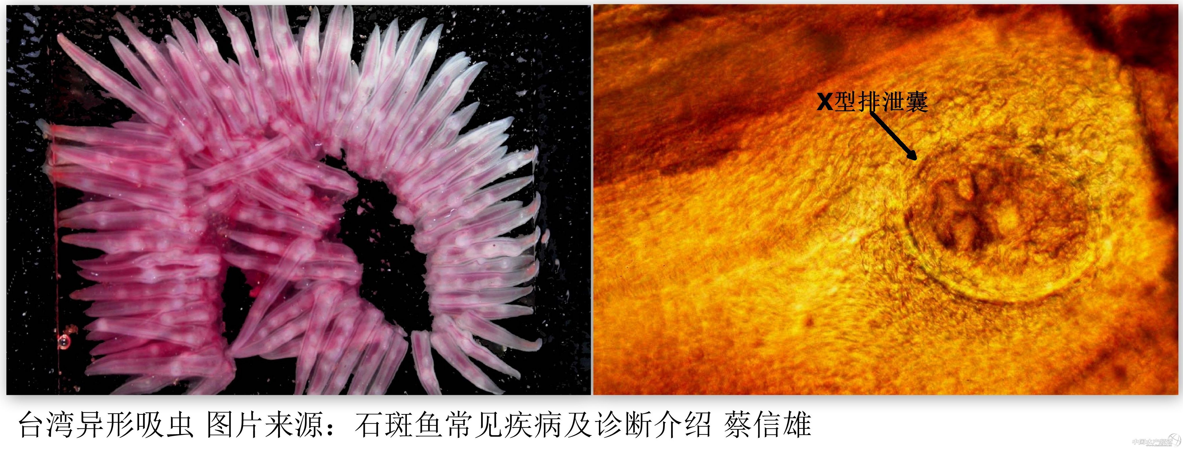 臺(tái)灣的蔡信雄教授(國(guó)立屏東科技大學(xué))在一份叫“石斑魚(yú)常見(jiàn)疾病及診斷介紹"的PPT中有提到臺(tái)灣異形吸蟲(chóng)在石斑魚(yú)身上寄生。這種吸蟲(chóng)第一宿主為貝類,第二宿主魚(yú)類,終宿主是水生鳥(niǎo)類。吸蟲(chóng)在尾蚴階段感染石斑魚(yú)的鰓部吸取營(yíng)養(yǎng),發(fā)育成后尾蚴,刺激鰓部黏液增生、壞死和出血,最后浮出水面被鳥(niǎo)類捕食。