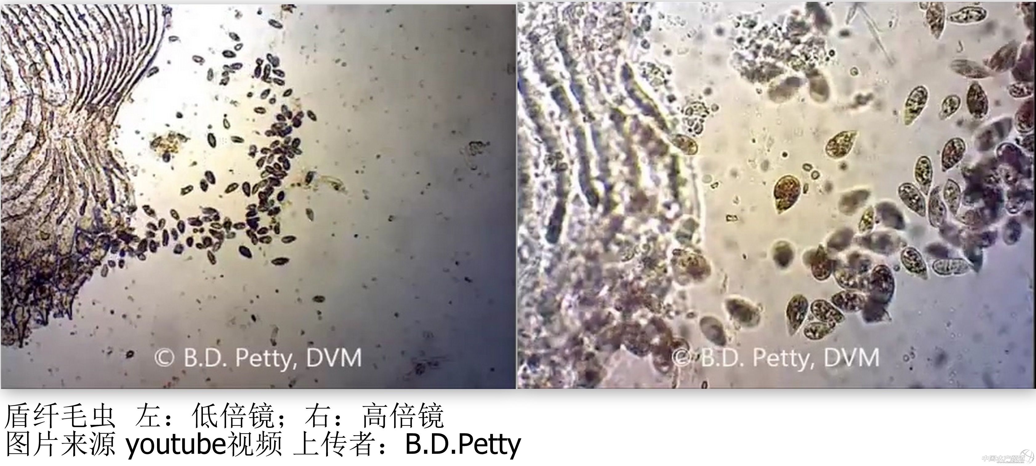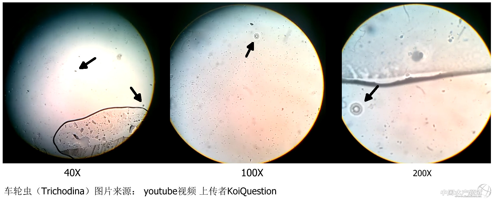 以上是高倍鏡下車輪蟲(chóng)的圖片,實(shí)際上車輪蟲(chóng)很小,只有20–100 μm,40倍鏡下其實(shí)也就1-2mm左右。種類很多,常見(jiàn)的有Trichodinella,Tripartiella及Trichodina等幾個(gè)屬,水產(chǎn)上又習(xí)慣把個(gè)體較小的Trichodinella和Tripartiella稱為小車輪蟲(chóng)。