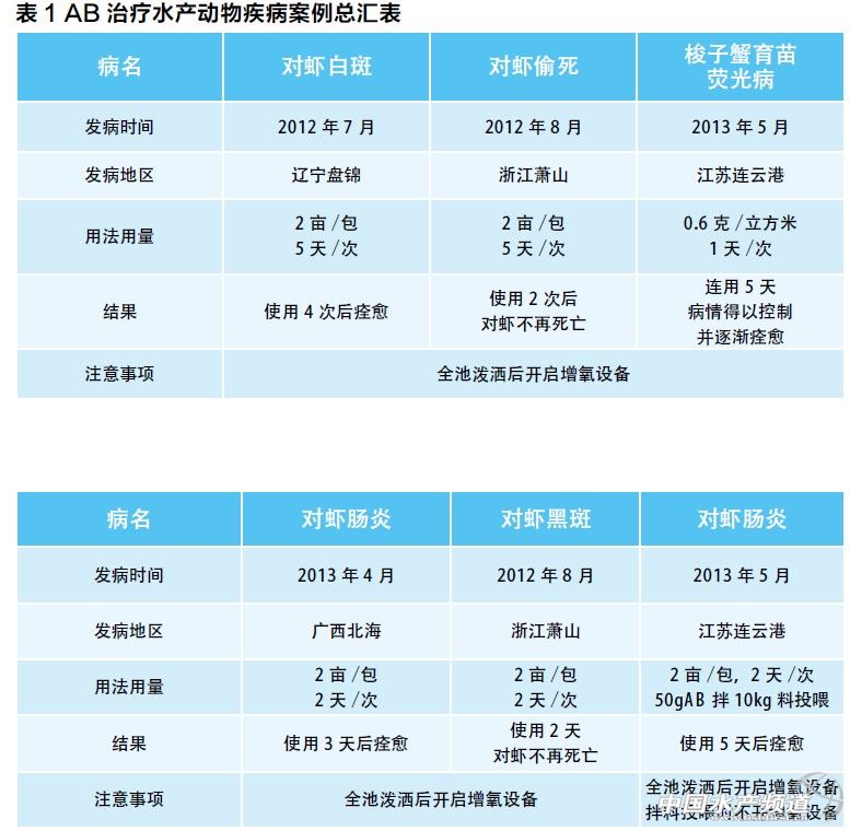 在水產動物育苗及養殖過程中,要堅持防重于治的原則,定期檢測水質和弧菌總量,每天巡塘。尤其是養殖中后期,隨著水產動物的不斷生長,殘餌、糞便也逐漸增多,各種病菌,尤其是弧菌的含量增加。實踐表明,一旦發現水中弧菌含量超過1000個/ml時,都需盡快使用養殖水體生物殺菌劑AB進行預防。否則,極有可能暴發各類細菌感染,造成水產動物大規模死亡(表1)。