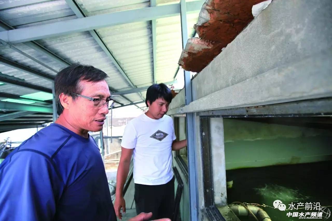 圣鯛水產科技創辦人黃成賢(左)表示圣鯛海水吳郭魚品系能適應30‰的海水鹽度,右為圣鯛董事長黃一圣
