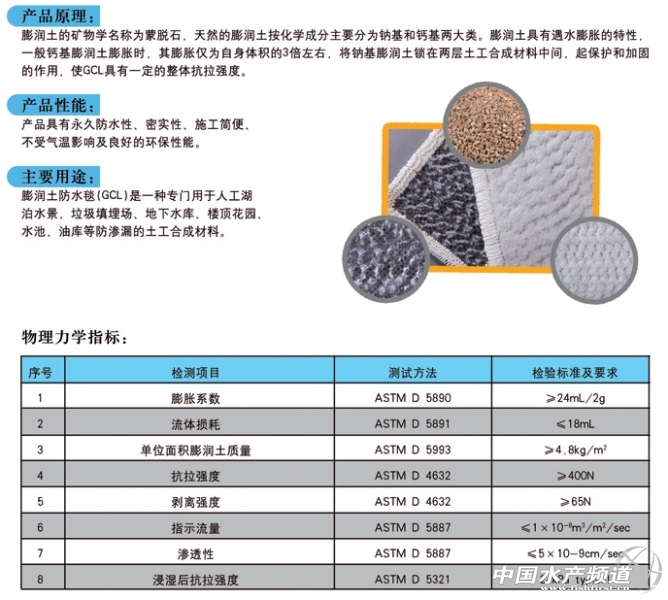 鈉基膨潤土防水毯 鈉基膨潤土防水毯_膨潤土防水毯的搭接國標5公斤膨潤土復合防水毯膨潤土復合防水毯(GCL)是一種新型土工合成材料,它是由一層粘土或其它低滲透性礦物材料外膜土工織物或土工膜,通過針刺或縫合的方法制成的復合防滲材料,本公司所采用的是高膨脹性的鈉基膨潤土,其特點是遇水后膨脹,產生水合作用,形成不透水的凝膠體,同時此種膨潤土還有儲存水分的能力,其吸收、含水量可達自身重量的10倍以上鈉基膨潤土防水毯》標準中按生產工藝將膨潤土防水毯分為三種:針刺法膨潤土防水毯(GCL-NP)、針刺覆膜法膨潤土防水毯(GCL-OF)和膠粘法膨潤土防水毯(GCL-AH)。針刺法鈉基膨潤土防水毯,是由兩層土工布包裹鈉基膨潤土顆粒針刺而成的毯狀材料;針刺覆膜法鈉基膨潤土防水毯,是在針刺法鈉基膨潤土防水毯的非織造土工布外表面上復合一層高密度聚乙烯薄膜制成的;膠粘法鈉基膨潤土防水毯,是用膠粘劑把膨潤土顆粒粘結到高密度聚乙烯板上,壓縮生產而成的一種鈉基膨潤土防水毯。