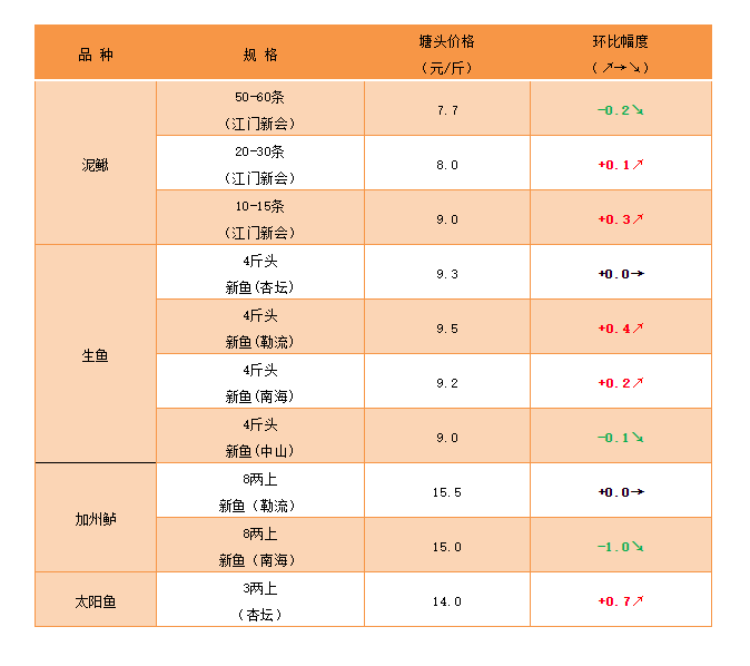 中國水產頻道原創報道,泥鰍、生魚、太陽魚上漲。 05-08